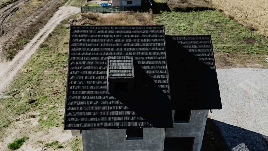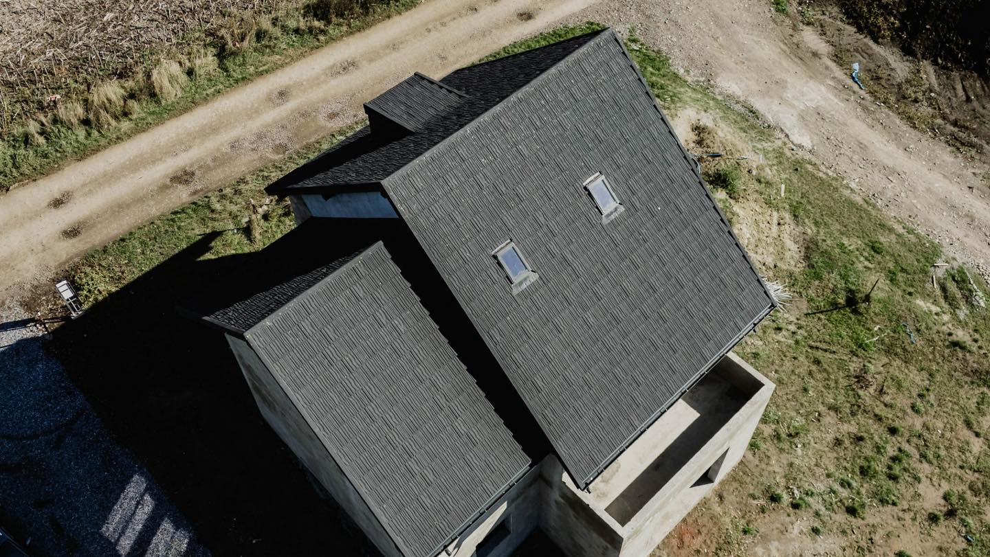Acoperiș modern, elegant și durabil, realizat cu țiglă metalică premium cu acoperire de piatră naturală. Rezistent la intemperii, coroziune și decolorare, acest acoperiș asigură protecție pe termen lung și o estetică impecabilă pentru orice locuință.